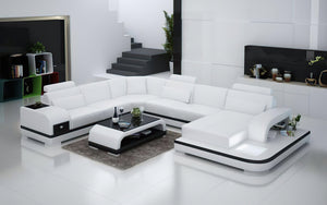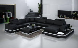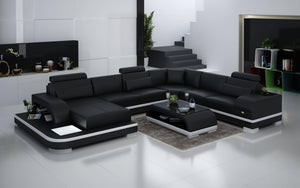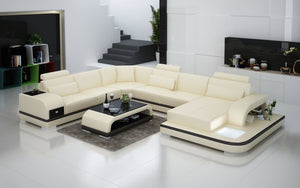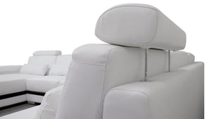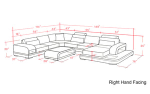 The Everly Leather Sectional with LED lighting is handmade with genuine Italian or bonded leather. This large leather couch is sleek and suits any modern living space. Its modular design can be customized to a configuration that fits your unique space - whether it is your living room or family room. Armrests are included to hold drinks and personal items. Each top headrest is adjustable. The storage space alongside the chaise is big enough to display books or decorative items. The spacious chaise is perfect to lay down and rest after a busy day. There is a small console to store away remotes and coasters or hold your TV snacks. The side of this leather couch is illuminated by a LED light. It can be optionally upgraded to multi-color lights that can be controlled by a wireless remote. Choose your configuration left-hand facing or right-hand facing chaise to customize to your desired design. This sleek, comfortable sectional is a must-have for every contemporary home. To complete the look of your living space we recommend adding the armless chair and coffee table. Cup holders and USB ports are recommended for larger families to optimize maximum enjoyment. An additional bed function makes a great movie night with the family or space for unexpected guests. With the generous size of this sectional, family and friends will gladly socialize in comfort.
